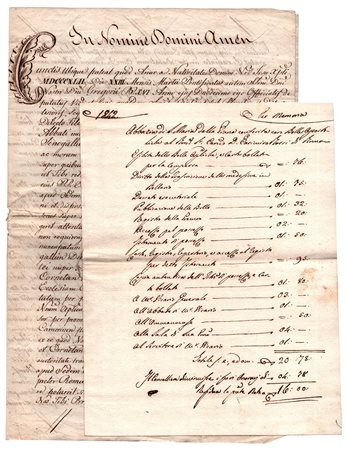 Lettera apostolica,datata '23 marzo 1842', nella quale viene assegnato un beneficio ecclesiastico a Casimiro Rossi, abate dell'Abbazia di Santa Maria della Piana nella diocesi di Senigallia. Quattro pagine in-4, in lingua latina. Casimiro Rossi di Cento († nel 1869) fu l'ultimo abate commendatario dell'Abbazia, prelato di fama per le sue conoscenze in giurisprudenza. E' accluso un documento (Due pagine in-8) contenente liste di spesa. -
