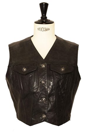 Gilet in pelle foderato in pelle fumo nero. Tasche sul petto e bottoni smaltati con Medusa. Prodotto in Italia negli anni '90. Taglia IT 40. Eccellente. -