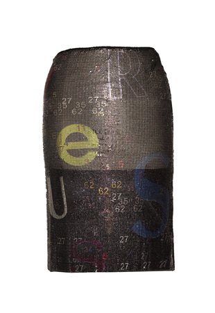 Gonna Versace Jeans signature. La parte frontale e' in maglia metallica nera con lettere e numeri colorati. Il dietro e' in viscosa nero. Made in Italy negli anni '90. Taglia 42. Perfettamente conservata. -