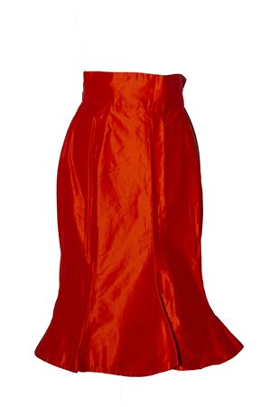 Lined midi skirt in red/orange iridescent silk taffeta. High strap that closes with hooks. Made in England in the 1990s. Size UK 14. Well preserved.