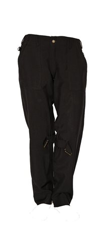 Black bondage pants, 100 per cent wool. Zip and botton closure. The band to close on calves is missing on both sides. Made in England late 80s. UK Size 30. Well preserved.