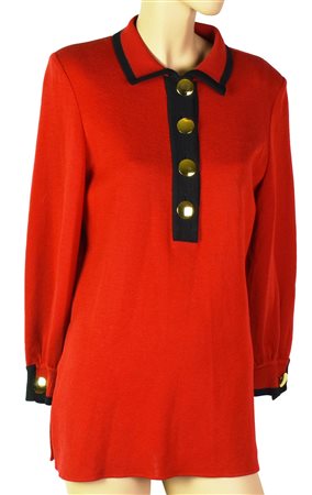 Maglione in cotone rosso bordato di nero. Spalline imbottite e bottoni dorati. Modello da sfilata senza etichetta. Taglia probabilmente 42. Ben conservato. Corredato da certificato di provenienza SVV LE BRECH ET ASSOCIES, Paris -