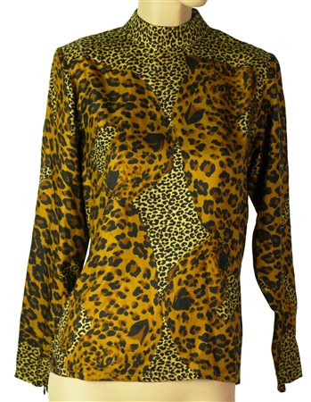 Blusa animalier in seta. Chiusure a zip sulla schiena e sulle maniche e spalline imbottite. Piccola scucitura sulla manica destra. Linea Yves Sain Laurent Rive Gauche, Francia, anni '70. Taglia 36, prodotto in Francia. Ben conservato. -