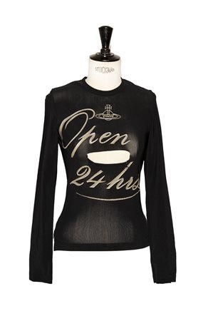 Black tulle stretch t-shirt with silver print and a cut in the center. Gold label. Zip on the back, long sleeves. Made in England. Size L. Anglomania Collection Fall Winter 1993. Perfectly preserved. Capo per collezionisti.