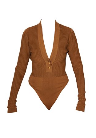 Body in tessuto di lana stretch con motivi a coste. Profonda scollatura, color senape. Made in Italy negli anni '90. Taglia S. Ben conservato. -