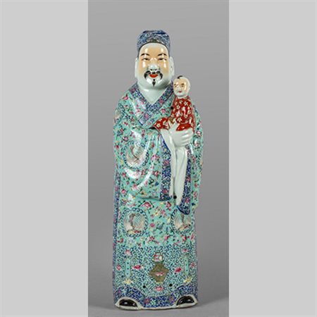 Lotto 0392 Grande figura di dignitario con bambino in porcellana policroma marcata alla base Cina fine sec.XIX