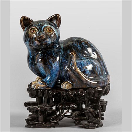 Lotto 0399 Gatto scultura in terracotta invetriata poggiante su base in legno intagliato Cina sec.XIX