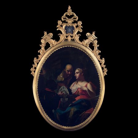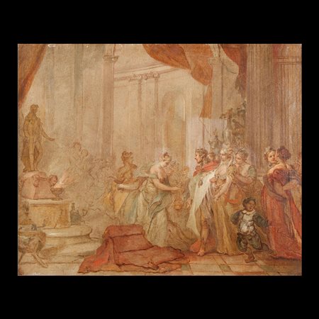 Lotto 44 Vittorio Maria Bigari (Bologna 1692 - 1776), Salomone e la Regina di Saba Pubblicazioni: A. Emiliani, in 'Bozzetti, Modelletti, Sketches dalla collezione Giorgio Baratti', a cura di A. Orlando, A. Scarpa, Genova, 2022, pp. 14-15. Olio su tela, dimensioni 46x57 cm.