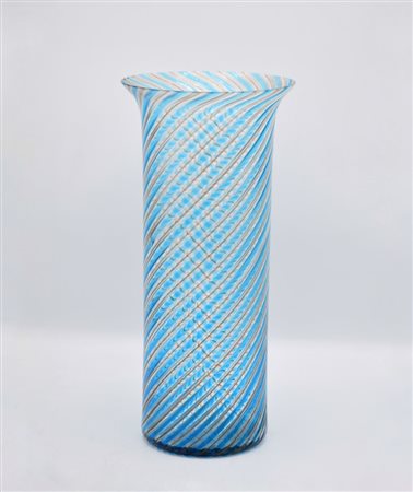 Realizzato in vetro trasparente con lavorazione a mezza filigrana con canne nei toni azzurro e oro, corpo cilindrico con collo lievemente svasato