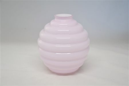 Realizzato in vetro soffiato opalino nei toni del rosa cipria, corpo globulare e breve collo
