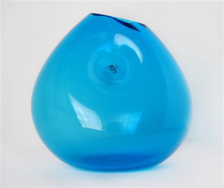 Realizzato in vetro soffiato azzurro, corpo globulare, particolare pinzatura a caldo al centro del vaso