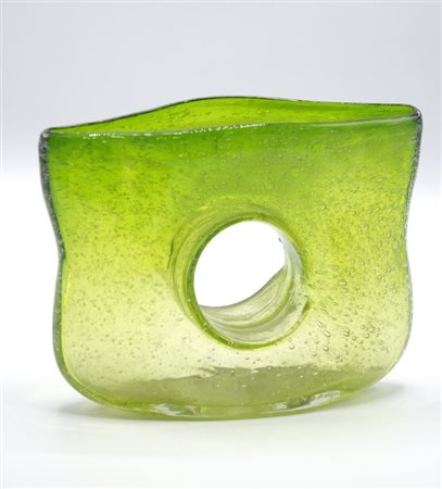 Realizzato in vetro bulicante di colore verde di forma ovale con grande foro circolare nella parte frontale