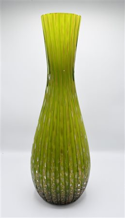 Raro e singolare vaso in vetro verde incamiciato giallo di forma geometrica