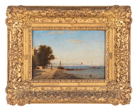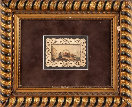 Lotto 499 Sebastiano De Albertis Milano 1828-Milano 1897 Marina con pescatore e barche Firmato in alto a destra "De Albertis" tempera su carta cm 5x8 - con cornice cm 30x37