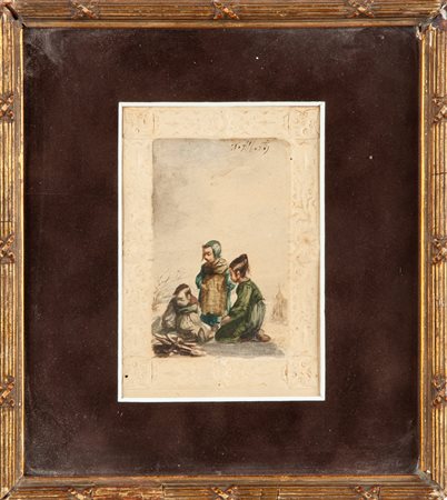 Lotto 500 Sebastiano De Albertis Milano 1828-Milano 1897 Intorno al fuoco Foglio con decorazione impressa lungo il perimetro. Firmato in alto a destra "De Albertis" tempera su carta cm 13x9 - con cornice cm 22x20