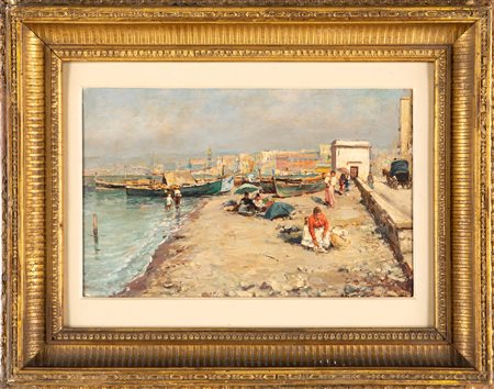 Lotto 518 Attilio Pratella Lugo 1856-Napoli 1949 Sulla spiaggia Firmato in basso a destra "A. Pratella" Olio su tavoletta cm 20x30 - con cornice cm 33x42
