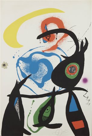 Lotto 14 MIRO' JOAN (1893 - 1983) Oda a Joan Mirò. 1975. Litografia. Cm 61,00 x 88,50. 23/75. Tiratura e firma in basso a matita. Edizione totale: 75 + XXV esemplari. Edizioni La Poligrafa S.A., Barcellona. Carta Guarro. Pubblicazione: Maeght, 1972-1992; n.910; Cramer n.175. Cornice presente
