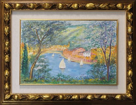 Lotto 9 MICHELE CASCELLA, "Veduta di Portofino", 1971, olio su tela, dim. 40x60. Al fronte: firma in basso a sinistra. Al verso: R/689, firma e dichiarazione di autenticità. Autentica su foto dell'artista. Opera con cornice.
