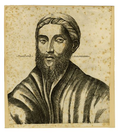 Lotto 1 Anonimo del XVI secolo, FRANC. MA. PARMIGIANO (Ritratto del Parmigianino). 1530-1550. Bulino. mm 240x214. Apparentemente non repertoriato. Sullo sfondo ai lati della testa "FRANC. MA. PARMIGIANO". Bellissima e rara prova su carta vergellata sottile con filigrana "cappello del vescovo" (simile a Briquet, 3406-3408). Si segnala altro esemplare presso il British Museum (inv. W,1.1). (1)