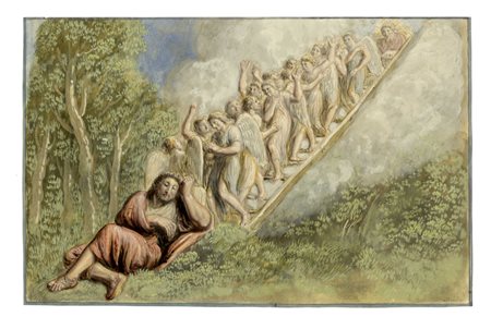 Lotto 2 Luigi Ademollo, Il sogno di Giacobbe. 1817 ca. Penna e inchiostro bruno, pennello, tempera e acquerello a colori, tracce di matita nera. Carta avorio lievemente spessa non vergellata. In basso a destra con grafia minuscola a matita nera "addemola". mm 220x337. Al verso a penna e inchiostro bruno "dessin d'Addemola / peintre Livournais". Il disegno trova riscontro nell'affresco a grisaille di medesimo soggetto nella chiesa di Santa Maria della Pieve ad Arezzo; la decorazione della pieve sembra databile al 1817 per una vicinanza stilistica con quella eseguita da Ademollo nella sala della Musica in Palazzo Pitti e risalente al 1816. Bibliografia: G. L. Mellini, Apertura per Luigi Ademollo, in "Arte illustrata", 7, n. 57, 1974, pp. 53-71; riedito con un'appendice documentaria in Id., Notti romane e altre congiunture pittoriche tra Sette e Ottocento, Firenze 1992, pp. 319-329; E. Radogna, L'espressione grafica in Luigi Ademollo: idee e progetti su carta per la committenza toscana in "Predella" 45-46, 2019, pp. 13-54. (1)