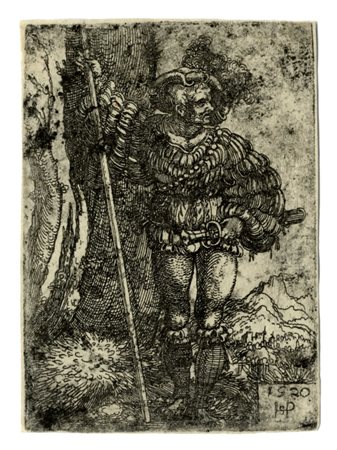 Lotto 5 Hans Sebald Beham, Lanzichenecco. 1520. Acquaforte su lastra di ferro. mm 92x66. Bartsch, 203. Pauli, 206. Hollstein, 206. Monogrammata e datata "1520" nella tabella in basso a destra. Bella impressione nell'unico stato, con alcune aree più scure dovute all'ossidazione della lastra, su carta vergellata sottile priva di filigrana. (1)