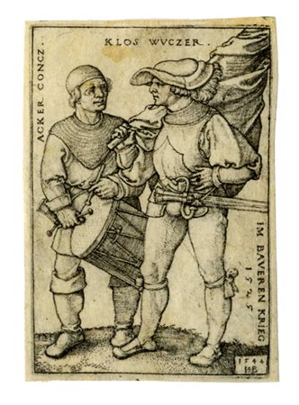 Lotto 6 Hans Sebald Beham, Il tamburino e l'alfiere. 1544. Bulino. mm 75x51. Bartsch, 199. Pauli, 202. Hollstein, 202. Con il monogramma e la data "1544" nella tavoletta in basso a destra. Bella impressione nel II e definitivo stato su carta vergellata sottile priva di filigrana. Al verso marchio di collezione a inchiostro nero non identificato con lettere "PER e V" interlacciate (Lugt, 895a). (1)