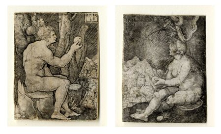 Lotto 7 Hans Sebald Beham, Adamo ed Eva seduti su tronchi d'albero. 1519. Bulino. mm 65/66x50. Bartsch, 1-2. Hollstein, 1-2. Con il monogramma e la data "1519" agli angoli in alto. Buone prove con alcuni punti di usura nel III e definitivo stato, dopo la comparsa del tratteggio diagonale nel cielo sulla tavola con Adamo e la riduzione della lastra con la figura di Eva, su carta vergellata sottile. Al verso di entrambi i fogli marchio della collezione Richard Jung (Lugt, 3791), al verso del foglio con Adamo altro marchio impresso a inchiostro bruno non perfettamente leggibile. (2)