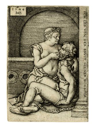 Lotto 8 Hans Sebald Beham, Cimone e Pero. 1544. Bulino. mm 72x49. Bartsch, VIII, 75. Hollstein, 82. Con il monogramma e la data "1544" nella tabella in alto a sinistra. Copia in controparte dal bulino di Barthel Beham datato "1525" (New Hollstein, 19). Bellissima impressione nel III stato di 3 dopo la comparsa dell'iscrizione sulla colonna e la cancellazione del nome "Czinmom" in basso, su carta vergellata sottile. Al verso marchio della collezione Alessandro Castagnari (Lugt, 86a), marchio della collezione Antonio Cesare Poggi (Lugt, 617) e altro piccolo marchio probabilmente con lettera "I" o lettera "F" non completamente leggibile. (1)
