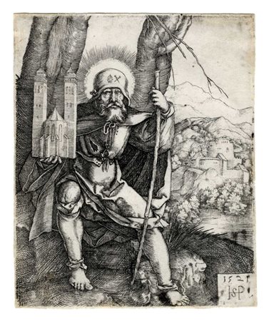 Lotto 9 Hans Sebald Beham, San Sebaldus. 1521. Bulino. mm 120x101. Bartsch, VIII, 65. Hollstein, 69. Con il monogramma e la data "1521" nella tabella in basso a destra. Il santo eremita e patrono di Norimberga è raffigurato con la veste da pellegrino mentre sorregge nella mano destra il modello della chiesa a lui consacrata. Ottima prova nel II stato di 2 dopo la riduzione della lastra, su sottile carta vergellata apparentemente priva di filigrana. (1)
