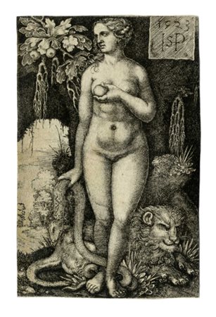 Lotto 10 Hans Sebald Beham, Eva. 1523. Bulino. mm 79x50. Bartsch, VIII, 4. Hollstein, 4. Con il monogramma e la data "1523" nella tabella in alto a destra. L'incisione viene considerata pendant con l'Adamo datato "1521" (Bartsch, VIII, 3. Hollstein, 3). Bellissima impressione nel II stato di 2, con la parte superiore del cielo coperta da tratteggio incrociato, su carta vergellata sottile. Al verso marchio della collezione Richard Jung (Lugt, 3791) e parte di marchio rotondo a inchiostro violetto non identificabile.. (1)