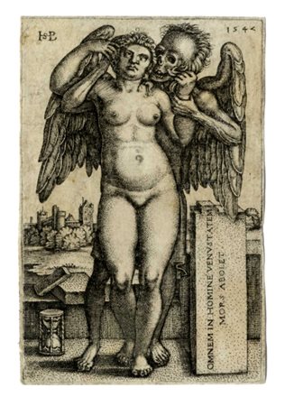 Lotto 11 Hans Sebald Beham, La Morte e giovane donna (La Morte cancella ogni bellezza). 1547. Bulino. mm 76x50. Bartsch, VIII, 150. Hollstein, 151. Con il monogramma in alto a sinistra e la data "1547" a destra. Bellissima prova, nel III e definitivo stato con il tratteggio diagonale sull'avambraccio della giovane, stampata con inchiostrazione piena e netta su carta vergellata sottile priva di filigrana. (1)