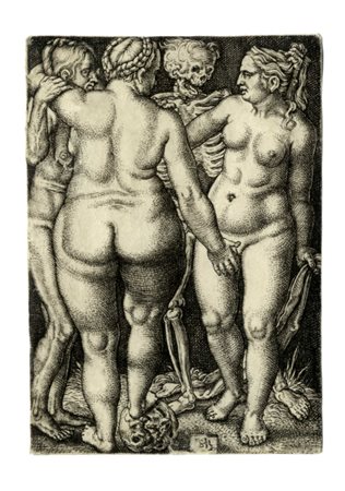Lotto 12 Hans Sebald Beham, La morte e tre donne nude. 1531-1550. Bulino. mm 77x54. Bartsch, VIII, 151. Hollstein, 152. Con il monogramma sulla tavoletta in basso al centro, ma privo di data. Bellissima prova nel III stato di 3, dopo la comparsa del tratteggio sulla guancia della donna in piedi sulla destra, impressa con inchiostrazione piena e brillante su carta vergellata sottile. (1)