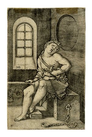 Lotto 13 Hans Sebald Beham, Cleopatra. 1531-1550. Bulino. mm 112x70. Bartsch, VIII, 77. Hollstein, 811. Con il monogramma al centro nel vano della finestra, ma privo di data. Ottima prova nel II stato di 2 dopo la comparsa di lievi graffi sul seno della donna, impressa con buona definizione di segno, su carta vergellata sottile. Al verso marchio di collezione del pittore milanese Augusto Caironi (Lugt, 426) e marchio a inchiostro violetto di Marco Guidelli Guidi (Asti, 1893- Solara, 1983) con indicazione del luogo "Solara", non su Lugt. Il generale d'artiglieria del Regio Esercito Marco Guidelli Guidi, fu successivamente Comandante militare del Corpo volontari della libertà della provincia di Modena, e infine, nel 1946 Presidente del Tribunale militare di guerra di Milano. (1)