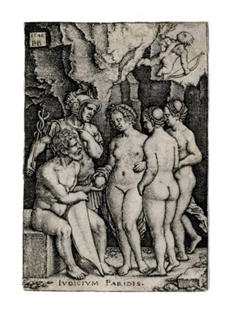 Lotto 14 Hans Sebald Beham, Iudicium Paridis. 1546. Bulino. mm 68x47. Bartsch, VIII, 89. Hollstein, 92. Con il monogramma e la data "1546" entro tabella in alto a sinistra. In basso "IUDICIUM PARIDIS.". Ottima prova nel II stato di 2 dopo la comparsa del tratteggio sulla tavoletta, impressa con bella definizione di segno, su carta vergellata sottile. (1)