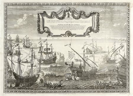Lotto 15 Jan Baptist Berterham, Desembarco del Rey Nuestro Señor delante de Baye de Napoles…, el dia diez y seis del mes de Abril de 1702. Bruxelles : E. H. Fricx, 1704. Acquaforte. mm 438x600. Foglio: mm 485x660. Con le firme del disegnatore Felipe Palota (luogo e data esecuzione: Madrid, 1703) e dell'incisore al margine inferiore. Rappresentazione dello sbarco del re di Francia a Napoli durante la guerra di successione spagnola (1702-1715). Dal volume Antonio Ubilla y Medina marques de Ribas (1643-1736), Succession de el Rey D. Phelipe V nuestro señor en la corona de España, diario de sus viages desde Versalles a Madrid, el que executo para su feliz casamiento, jornada a Napoles, a Milan y a su exercito, sucessos de la campaña y su buelta a Madrid / lo escribio ... Don Antonio de Vbilla y Medina ... En Madrid: por Juan Garcia Infanzon, 1704. (1)