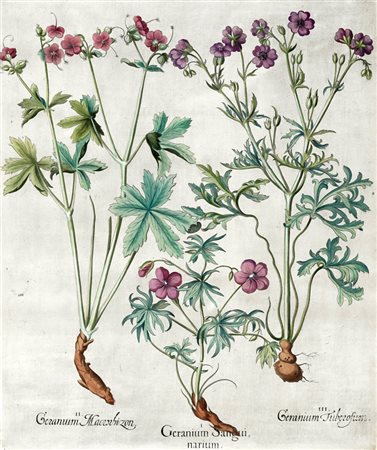 Lotto 17 Basilius Besler, Quattro tavole da Hortus Eystettensis. 1613. Bulino, tempera e acquerello a colori. mm 470/472x390/394. Foglio: mm 505/520x405/410. 1) Cistus flore albo, Balaustium flore minori Romanum, Cotinus; 2) Ericaminor flore albo..., Lychnis Coronaria flore albo simplici, Lychnis Coronaria flore rubro simplici; 3) Eryngium Pannonicum latifoium, Hyssopus flore albo, Hyssopus flore rubro...4) Geranium sanguinarium, Geranium Macrorrhizum, Geranium Tuberosum. Da Hortus Eystettensis. Bellissime prove, stampate su carta vergellata con filigrana "serpente" visibile su due fogli, dall'edizione di lusso del 1613 priva di testo al verso. (4)