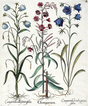 Lotto 19 Basilius Besler, Quattro tavole da Hortus Eystettensis. 1613. Bulino, tempera e acquerello a colori. mm 470/472x390/394. Foglio: mm 505/520x405/410. 1) Chamaenerion, Campanula caerulea persici folia, Campanula alba persicifolia; 2) Althaea Vulgaris, Althea Fruticans Hispanica; 3) Buglossum semper virens Hispanicum latifolium, Buglossum Italicum flore albo, Buglossum Italicum flore coeruleo. 4) Symphiitum maius flore purpureo, Symphiitum maius flore rubro, Symphiitum flore pallido. Da Hortus Eystettensis. Bellissime prove, stampate su carta vergellata con filigrana "serpente" visibile su tutti i fogli, dall'edizione di lusso del 1613 priva di testo al verso. (4)