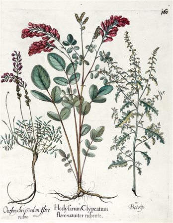 Lotto 20 Basilius Besler, Quattro tavole da Hortus Eystettensis. 1613. Bulino, tempera e acquerello a colori. mm 470/472x390/394. Foglio: mm 505/520x405/410. 1) Hedysarum Clypeatum..., Onobrychis Dodon flore rubro, Botriis; 2) Hyacinthus Anglicus, Hyacinthus Anglicus flore incarnato, Hyacinthus Anglicus colore violaceo; 3) Hyacinthus Orientalis maiorflo:coeruleo, Hyacinthus Orientalis maior violaceo colore. 4) Limonium Syriacum, Calamentha Angustifoliis, Coronopus. Da Hortus Eystettensis. Bellissime prove, stampate su carta vergellata con filigrana "serpente" visibile su tutti i fogli, dall'edizione di lusso del 1613 priva di testo al verso. (4)