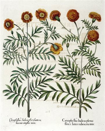 Lotto 21 Basilius Besler, Quattro tavole da Hortus Eystettensis. 1613 [1640/1713]. Bulino, tempera e acquerello a colori. mm 470/472x390/394. Foglio: mm 525/560x420/440. 1) Consolida Arvensis..., Consolida regalis flore pleno, Consolida regalis flore pleno purpureo; 2) Hippoglossum, Primula Veris Anglicana, Sanicula montana; 3) Folium Opuntiae cum flore & fructu, Fructus Opuntiae, Fructus Opuntiae dimidio dissectus. 4) Caryophylluss Indicus plenus..., Caryophylluss Indicus flore luteo rubescente... Da Hortus Eystettensis. Bellissime prove, stampate su carta vergellata pesante dall'edizione con testo al verso. (4)