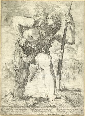 Lotto 24 Orazio Borgianni, San Cristoforo con Gesù Bambino sulle spalle. 1614-1616 ca. Acquaforte. mm 385x288. Bartsch, XVII, 53. Firmata al margine inferiore a destra sotto la dedica a Juan de Lezcano segretario di De Castro, ambasciatore spagnolo a Roma. Buona prova nel II stato di 2 con l'indirizzo di De Rossi, su carta vergellata lievemente spessa con filigrana "santo inginocchiato con piccola croce entro scudo stretto" (Woodward, 25. Macerata 1618). (1)