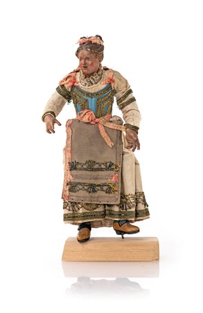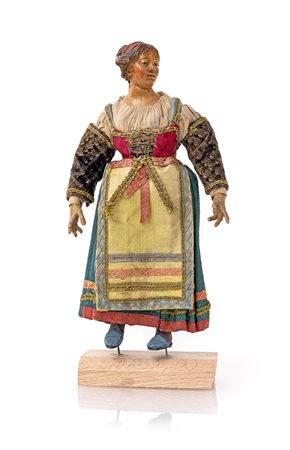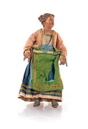 Contadina ricca, ambito di Domenico Antonio Vaccaro (1681 - 1750) camicia bianca con maniche in velluto, corsetto rosso, gonna azzurra a pieghe e sinale giallo con ricami e galloni. Difetti e restauri