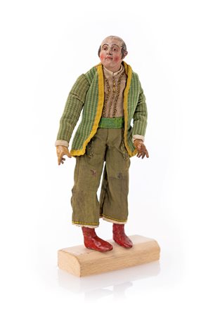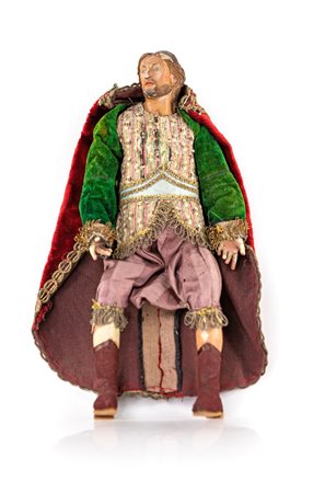 Figura maschile (paggio) con mantello in velluto rosso barba e capelli biondi, giacca in ormesino con maniche di velluto verde, pantaloni alla zuava rossi con galloni. Modellato per stare seduto su un carro