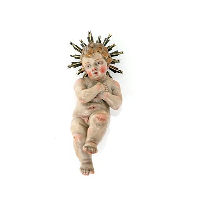 Bambin Gesù in terracotta policroma con le mani giunte sul petto e la gamba sinistra lievemente sollevata; aureola a raggiera in metallo dorato cm 8,5 - diametro cm 3,8 -