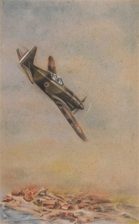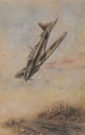 Lotto 11 Künstler des 20. Jahrhunderts/Artista del Novecento Fairey Battle in picchiata su villaggio, Anni ’40;Pastelli col. su carta applicata su cartone, 50 x 32,5 cm, carta brunita