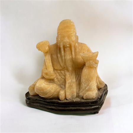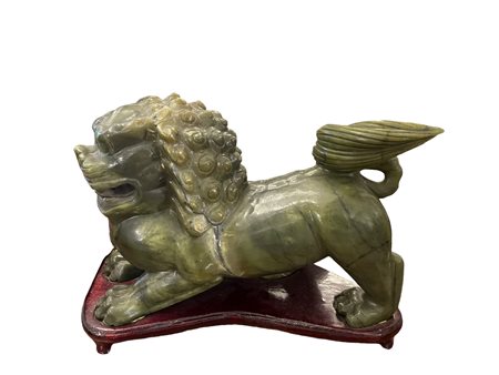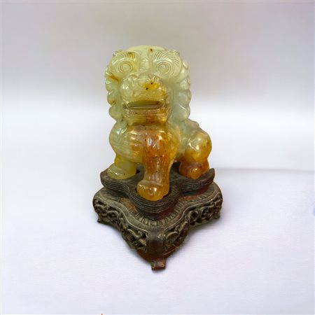 Lotto 3 scultura in volume, in giadeite, su base in legno. Arte dell'Estremo Oriente. Restauri.