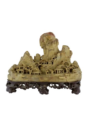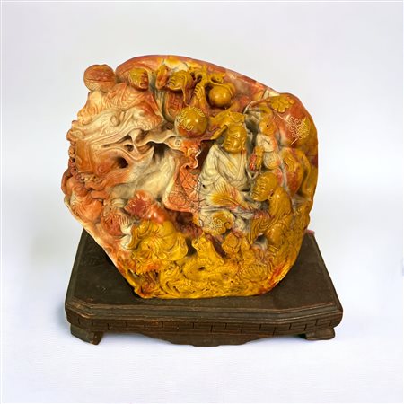 Lotto 4 Scultura in forma in materiale lapideo, giadeite, con basamento in legno. Arte dell'Estremo Oriente.