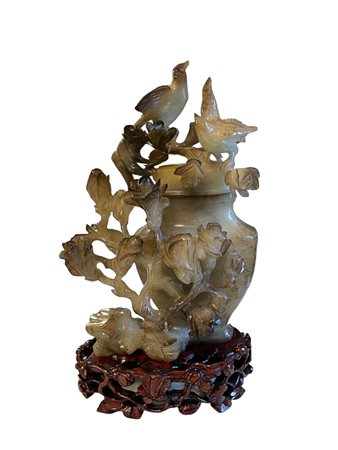 Lotto 21 In giadeite grigia, con elementi fitomorfi e coppia di volatili, su base in legno, scolpito e traforato. Arte dell'Estremo Oriente. Rottura al coperchio.