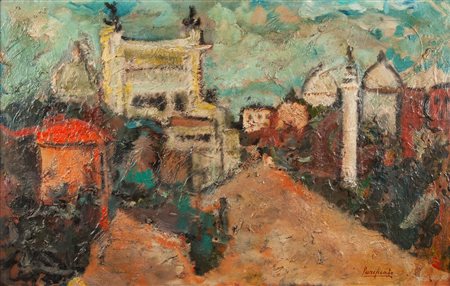 Veduta di Roma Olio su tavola cm 55x87 - in cornice cm 80x111 Firma in basso a destra "Purificato". Al verso reca etichetta parzialmente leggibile "Vedute Romane, Paesaggio e colore di Roma nell'arte contemporanea, Collezione Zavattini, Domenico Purificato". -