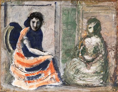 Composizione con due figure 1952 ca Tempera e matita su carta applicata su tela cm 41x52 In basso a destra firma "Sironi". Al verso reca timbri della Galleria Carini Milano e della Galleria d'Arte Leonardiana Alassio. Etichetta della Galleria d'Arte Leonardiana Opera archiviata dall’Associazione per il Patrocinio e la Promozione della Figura e dell’Opera di Mario Sironi, Milano. Certificazione di autenticità su fotografia rilasciata da Willy Macchiati, 1973