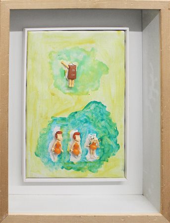 Lotto 14 MARIO SCHIFANO, "Senza Titolo" (Flinstones), 1997, smalto e collage di oggetti su tela, dim 30x20, opera archiviata dall'Archivio Generale dell'opera pittorica di Mario Schifano al numero 61/97 in data 20 novembre 1971 a cura dell'artista e della Galleria Monte Titano Arte. Al verso: in alto al centro firma, in basso a destra etichetta archivio generale: numero di archivio, titolo, tecnica, dimensioni, anno. Opera con cornice.